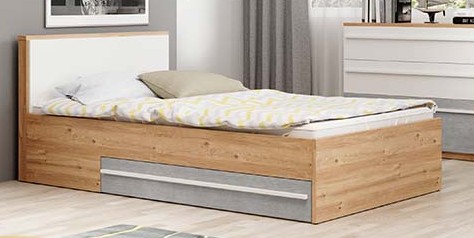 - Ciekawy efekt daje proste połączenie kolorów – skrzynię wykonano z dekoru przypominającego ciepłe drewno, front szuflady jest szary, a zagłówek zaakcentowano gustowną bielą.