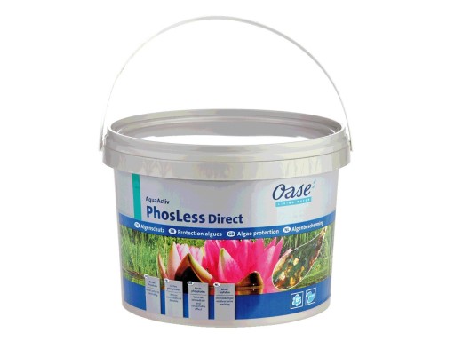 Oaze PhosLess Direct usuwa szybko i skutecznie z wody stawu ważny składnik pokarmowy glonów - fosforan. Całkowitą zawartość można zmniejszyć poniżej wartości granicznej wymaganej dla wzrostu glonów wynoszącej 0,035 mg/l. W ten sposób chroni się trwale staw przed nadmiernym wzrostem glonów. Ponadto system wieloskładnikowy powoduje wyjątkowo szybkie usuwanie fosforanów z wody. Przy pomocy zintegrowanego dawkowania przez rozsypywanie łatwo dozuje się PhosLess Direct. Nadaje się idealnie do zapobiegania glonom w miesiącach zimowych.
