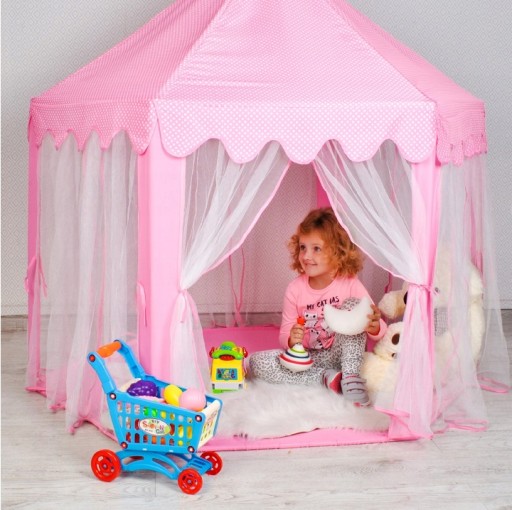 Namiot dla dzieci to wspaniały sposób na kreatywną i fantazyjną zabawę w domu, jak i poza nim. Pobudza wyobraźnię i pozwala na radosne spędzenie czasu samemu lub w większym gronie, bez ograniczenia wiekowego. Piękny namiot, w postaci rozkładanego sześciokątnego pałacu, który zadowoli każdą małą księżniczkę. Śliczny namiot z baldachimem znajdzie swoje miejsce zarówno w pokoiku, jak i tarasie czy w ogrodzie.Namiot jest bardzo duży, dlatego jednocześnie w nim może przebywać kilkoro dzieci.