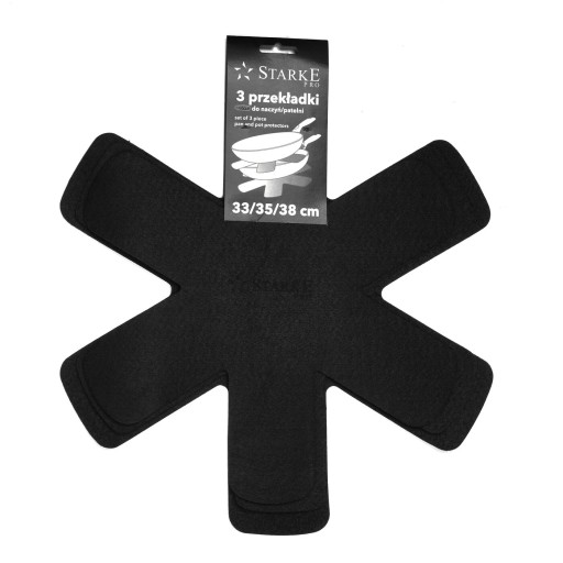 Filcowe przekładki do patelni Starke Pro mają trzy różne średnice. W zestawie znajdziesz osłonki do naczyń o szerokości 33, 35 i 38 cm. Kształt gwiazdy sprawia, że dobrze dopasujesz je do patelni i garnków, bez względu na wysokość rantu. Zabezpieczysz przy tym powłokę nieprzywierającą – dno i boki wewnątrz naczynia. Stosując przekładki z filcu, możesz układać patelnie jedna na drugiej. Komplet osłonek sprawdzi się również jako podkładki pod rozgrzane garnki. Gorące dno garnków nie uszkodzi zarówno ich, jak i blatu kuchennego lub stołu. Ich dyskretny i elegancki czarny kolor dopasuje się do różnego stylu przestrzeni do gotowania.