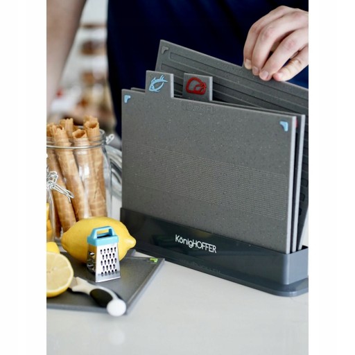 Zestaw 4 desek do krojenia ze stojakiem elegancko prezentuje się na kuchennym blacie. Sprawdza się też podczas krojenia różnych składników. Każda z desek służy do czego innego. Ich powierzchnia przystosowana jest specjalnie do krojenia pieczywa, mięsa, warzyw i owoców oraz ryb. Powłoka desek sprawia, że nie tępią się przy krojeniu noże, a deski nie pochłaniają aromatów. Łatwo też je umyć, chociażby w domowej zmywarce. Ślizganiu się na blacie podczas krojenia zapobiegają umieszczone na nich silikonowe wstawki w różnych kolorach.