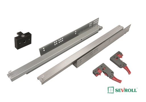 Prowadnica dolnego montażu renomowanej marki SEVROLL charakteryzuje się pełnym wysuwem, cichym domykiem oraz regulacją w trzech płaszczyznach.