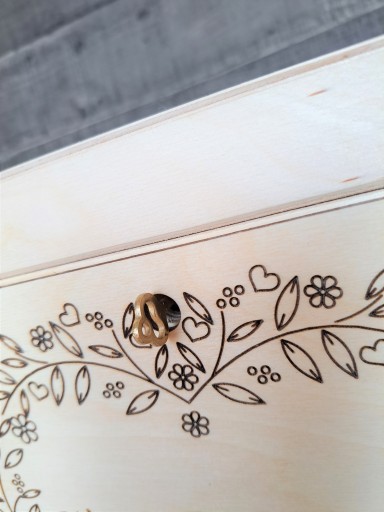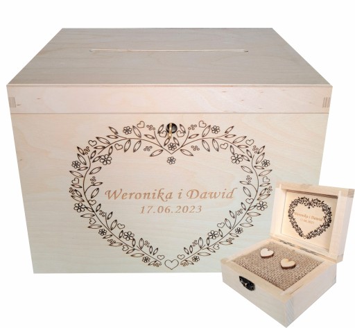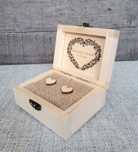 Wewnątrz pudełka znajduję się dekoracyjna jutowa poduszeczka oraz dwa drewniane serduszka, na których umieszcza się obrączki. Na wieczku pudełka znajduje się wygrawerowane stylizowane, kwiatowe serduszko oraz inicjały Państwa Młodych, w środku natomiast widnieją imiona Nowożeńców i data zaślubin.