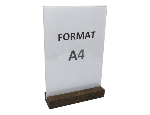 Stojak na menu typu T wykonany jest z plexi przeźroczystej o grubości 2 mm oraz podstawki z drewna bukowego, pomalowanego w kolorze wenge. Podstawka jest starannie obroniona i ma 70 mm szerokości, co sprawia, że stojak jest odpowiednio stabilny.