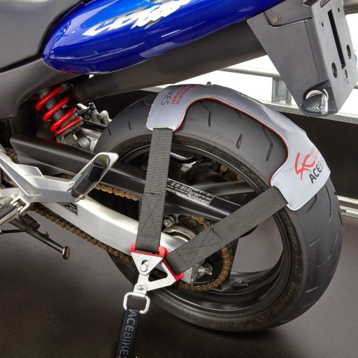 I to właśnie jest zadania dla transportowego systemu zabezpieczającego Acebikes. TyreFix Basic zakłada się na tylną oponę, a następnie mocuje za pomocą odpowiednich pasów napinanych. Po stronie stykającej się z oponą TyreFix Basic jest wyposażony w specjalny materiał zapewniający przyczepność, dzięki czemu opona się nie ześliźnie. Motocykl jest zabezpieczony.