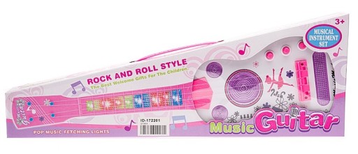 Zabawka posiada cztery plastikowe struny, efekty świetlne i dźwiękowe.