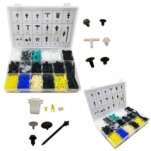 Uniwersalny zestaw 17 rodzajów spinek, klipsów, kołków, zatrzasków samochodowych do mocowania tapicerki w samochodzie, błotników, zderzaków, drzwi.