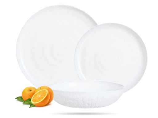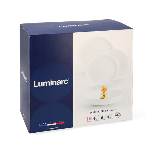 Serwis obiadowy Ammonite Luminarc. Zestaw talerzy obiadowych i deserowych, śniadaniowych wykonany z białego szkła hartowanego. Ammonite to połączenie klasycznej bieli z ciekawą, nowoczesną fakturą inspirowaną amonitem - spiralną muszlą. Serwis przeznaczony dla 6 osób. Można myć w zmywarce i stosować w mikrofali. Zestaw w oryginalnym opakowaniu.