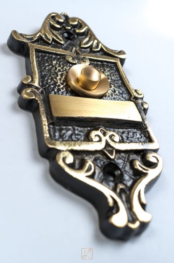 Wizytówka odlana z mosiądzu, patynowana, przepolerowana w miejscach eksponowanych, ciemniejsza w zakamarkach. Prostokątne miejsce na grawer, wykończone w złotej satynie, bez połysku. Wizytówka montowana na 2 śruby. Przycisk dzwonkowy również wykonany z mosiądzu, czoło przycisku matowane, klasa szczelności IP43. Przycisk daje możliwość sterowania urządzeń niskiego i wysokiego napięcia takich jak: dzwonki, domofony, zamki elektromagnetyczne. Wizytówka i przycisk pokryte lakierem zapobiegającym utlenianiu się mosiądzu. Produkty polskie — wspieramy polskie rzemiosło.