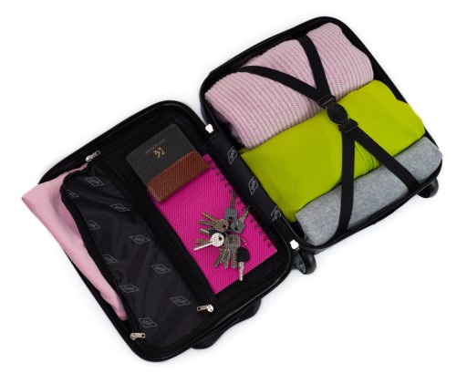 - Środek walizki wykończony wytrzymałą podszewką, pasy do mocowania bagażu