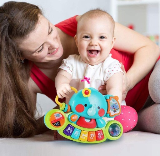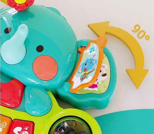 Funkcja 2 – nutka: Efekty dźwiękowe - odgłosy słonika, wesołe melodyjki i dźwięki. Podświetlane policzki słonika, obracana trąbka z efektami dźwiękowymi, wyciągany kwiatuszek z efektem dźwiękowym, książeczka z efektami dźwiękowymi wesołych melodii, pomarańczowe pokrętło z dźwiękiem śmiechu dziecka. Do, re, mi... na klawiszach pianinka.