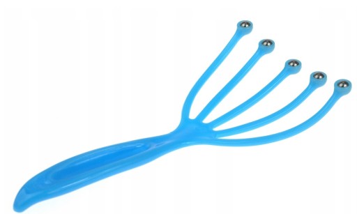 Masażer do skóry głowy w postaci 5-palczastych grabek, z wygodną rączką sprawdzi się doskonale do wykonania masażu, a także do rozprowadzania kosmetyków na skórze głowy. Na końcu grabek znajdują się obrotowe, metalowe kulki, które delikatnie suną po skórze głowy. Wypustki są delikatne dla skóry oraz włosów, nie powodują ich wyrywania ani ciągnięcia.