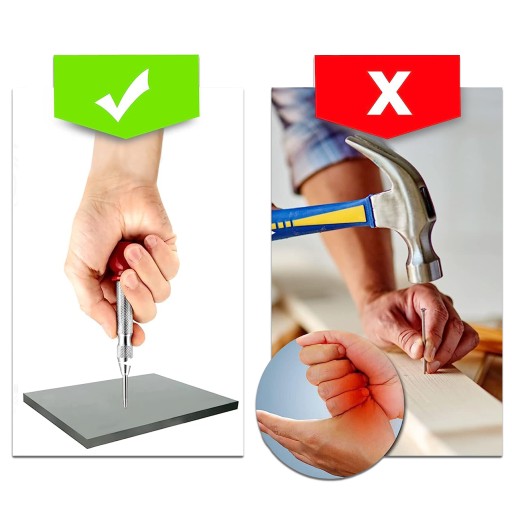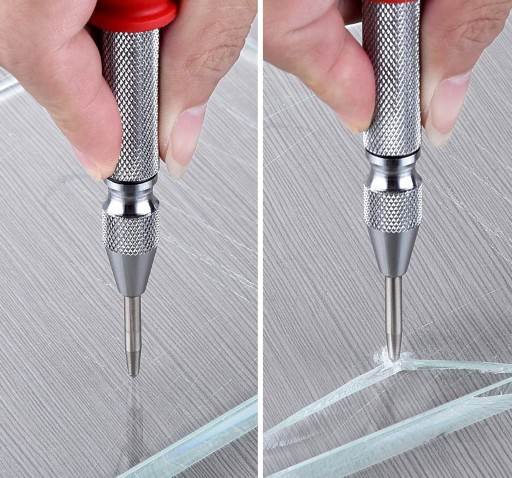 - Przystawić punktak ostrym końcem do znaczonego materiału. Docisnąć silnie ręką , iglica uderzając zaznaczy trwale punkt na materiale. Punktak nie wymaga naciągania sprężyny -odbywa się to w sposób automatyczny. Bezpośrednio po dociśnięciu iglicy do materiału i uderzeniu, możemy powtórzyć czynność, zaznaczając kolejny punkt.