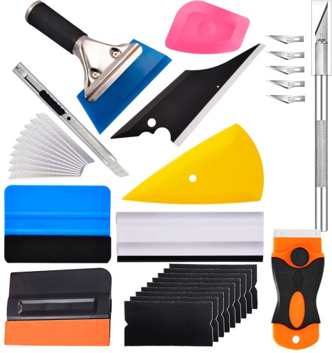 Zestaw narzędzi pomocnych przy montażu folii przyciemniającej na szybach, folii samochodowych. Zestaw zawiera 12 elementów. Rakle, skrobak do szyb, nożyki itp.