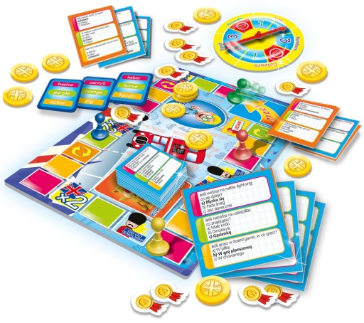 Zawartość: plansza, 4 pionki, spinner, 48 kart z pytaniami, żetony i odznaki, karty specjalne.