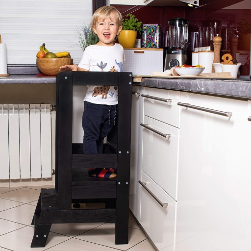 Ogromną zaletą kitchen helpera jest możliwość regulacji wysokości podestu na 3 poziomach - 22,cm, 35 cm lub 51 cm. Wystarczy wyjąć ruchomą podstawę i zamontować ją na jednej z 3 możliwych wysokości. Zabudowana górna część sprawia, że dziecko jest w pełni bezpieczne podczas przygotowywania różnego rodzaju posiłków w kuchni. Zadbaliśmy również o detale takie jak staranne wyszlifowanie krawędzi.