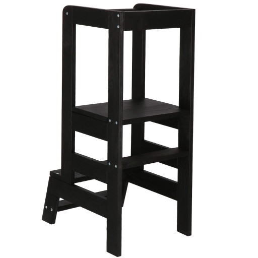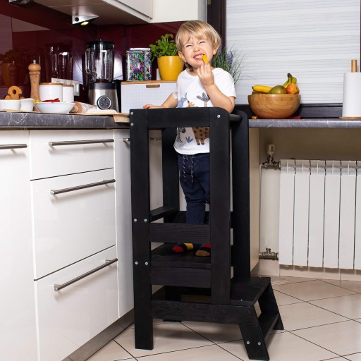 Kitchen Helper wyposażono także w 2 schodki, dzięki którym dziecko może samodzielnie wyjść na podest. Mniejsze pociechy mogą zostać włożone do środka przez rodziców. Warto zaznaczyć, że pomocnik jest bardzo stabilny i solidny, co jeszcze bardziej zwiększa bezpieczeństwo jego użytkowania. Sam regulowany podest posiada na spodzie stopery, które uniemożliwiają przesuwanie się podestu pod nóżkami malucha.
