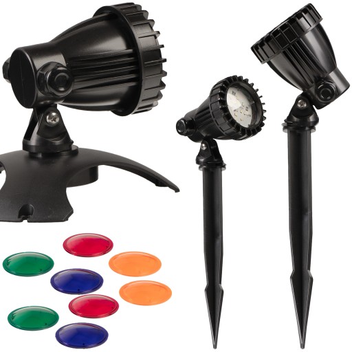 Kolorowe oświetlenie LED ogrodowe i do oczka wodnego. Jest całkowicie wodoodporne i może pracować w pełnym zanurzeniu. Zestaw posiada możliwość wbicia w lampek ziemię na szpice lub montaż na ciężkiej podstawce. Ruchoma głowica światła i długi przewód zasilający dają Ci sporo możliwości. W zestawie 3 lampki i kolorowe szkiełka.