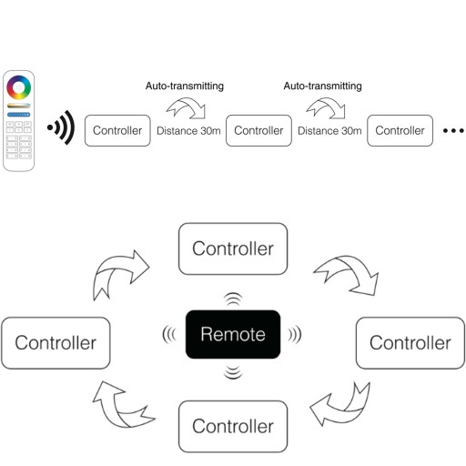 Wszystkie parametry kontrolera synchronizują się automatycznie z innymi urządzeniami znajdującymi się w zasięgu. Dzięki temu uzyskujemy identyczny efekt oświetlenia bez znaczenia na kolejność uruchomienia danego produktu.