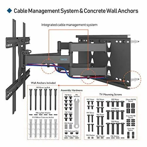 • System zarządzania kablami - Uchwyt ścienny TV posiada zintegrowany system zarządzania kablami, który pozwala ukryć nieestetyczne kable, dzięki czemu miejsce oglądania jest czyste i uporządkowane. W komplecie znajduje się ilustrowana instrukcja, poziomica, kotwa do ściany betonowej oraz wszystkie niezbędne elementy wyposażenia produktu.