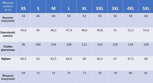 - dla wykonania marynarki: szerokość ramion, obwód klatki piersiowej, rękaw od ramienia w dół