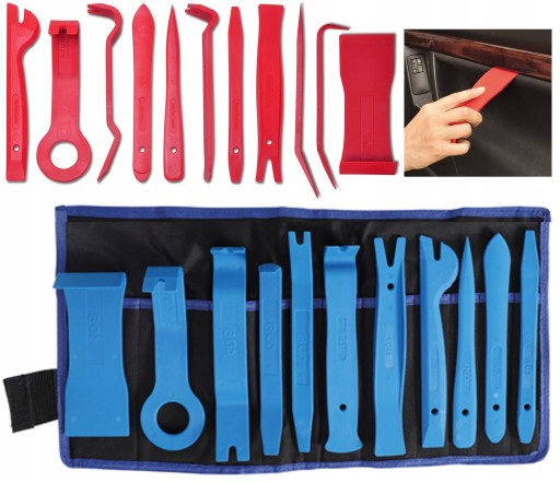 Zestaw zawiera elementy umożliwiający szybki demontaż tapicerki z każdego wnętrza samochodu,