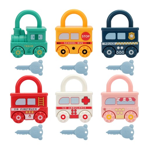 Aż sześć uroczych samochodziko-kłódek: lokomotywa, autobus szkolny, radiowóz, straż pożarna, karetka i lodziarnia, które zapewniają wiele możliwości zabawy!