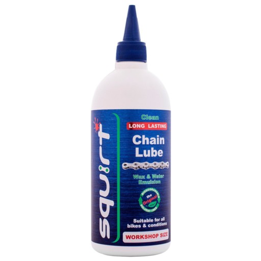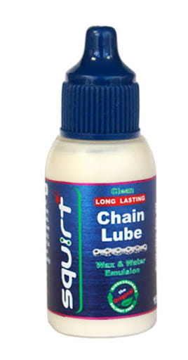Squirt Lube to smar na bazie wosku, zapewniający długotrwałe i skuteczne smarowanie łańcucha i innych elementów napędu. Zmniejsza zużycie oraz zapewnia cichą i wydają pracę napędu.Squirt Lube to przełomowa formuła emulsji zawierająca starannie wyselekcjonowane rodzaje wosku oraz wodę będącą nośnikiem emulsji.Bez dodatku syntetycznych rozpuszczalników dzięki czemu jest ekologiczny i w 100% biodegradowalny.Odpowiednio dobrana gęstość emulsji skutecznie wnika między przestrzenie pomiędzy ogniwami łańcucha.Woda po odparowaniu pozostawia cienką, jednorodną warstwę ochronna wosku która zapewnia idealne smarowanie oraz wysoką odporność na przywieranie brudu, błota i kurzu co oznaczą dłuższą żywotność napędu.Squirt Lube to idealne połącznie odporności na zabrudzenie, wydajnego smarowania i odporności na wymywanie.