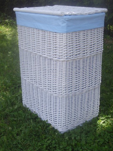 Kufer wiklinowy w kolorze białym z niebieskim obszyciem bawełnianym.