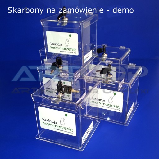 Nasza firma opracowała proste, ale jednocześnie unikalne wieko skrzynki, co sprawia, że fundusze wewnątrz jej są lepiej chronione. Klapa z bocznymi zagięciami, to nasz pomysł na udoskonalenie skarbonki. Został poparty doświadczeniami i testami jakie zrobiliśmy kilka lat temu. Nasze rozwiązanie chętnie kopiują inne firmy, ale ten kształt wieka jest naszym "patentem" opracowanym w firmie ARTCOP. Kiedy publikowaliśmy pierwsze fotki w internecie z naszym opracowaniem, nikt w Polsce i Europie takich nie proponował. Dziś wszyscy chętnie je wdrażają.