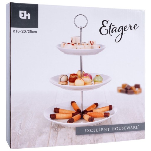 Trzypiętrowa patera do serwowania oraz ekspozycji. Świetnie prezentować się będą na niej babeczki, ciasteczka, różnego rodzaju desery jak również przystawki. Idealnie sprawdzi się do przygotowania słodkich stołów, dzięki niej w efektowny sposób wyeksponujemy na stole słodkości oraz słone przekąski. Sprawdzi się do użytku domowego oraz profesjonalnego. Wyprodukowano zgodnie z europejskimi standardami.