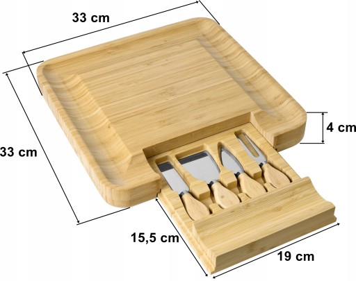 Wykonana ze 100% drewna bambusowego wysokiej jakości. Doskonały pomysł na prezent dla miłośników serów i nie tylko. Deska wyposażona w szufladkę, w której znajduje się komplet noży ze stali nierdzewnej. Wgłębienia na brzegach pozwalają na efektowne ułożenie przekąsek i dodatków. Dodatkowe akcesoria ułatwią nakładanie i krojenie przekąsek oraz utrzymanie porządku na stole. Deska świetnie sprawdzi się podczas każdej imprezy czy spotkań ze znajomymi.