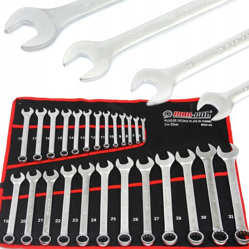 W komplecie znajdują się klucze: 6,7,8,9,10,11,12,13,14,15,16,17,18,19,20,21,22,23,24,25,26,27,28,30,32 mm.