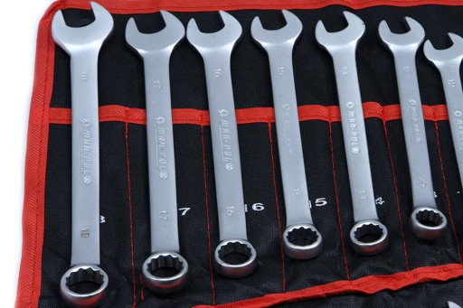 Komplet kluczy płasko-oczkowych wykonanych ze stali CrV, spakowanych w płachtę materiałową i oczkami do powieszenia na ściania.