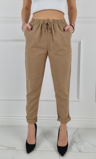 Spodnie Lniane z dodatkiem bawełny , posiadają wysoki stan. Świetne połączeniu ze szpilkami, dzięki swojej uniwersalności, pasują niemal do każdej stylizacji. Elastyczny materiał podkreśla kobiecą sylwetkę. Spodnie są dopasowane, rozciągają się. Podkreśl swoje kobiece kształty! Spraw, by Twój codzienny Look był niepowtarzalny.
