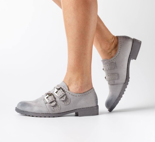 Nowy model półbutów zamszowych w szarym kolorze. Trzewiki posiadają 2 paski z klamerkani i małymi nitami w kolorze srebrnym. Cholewka jest wykonana z ekologicznej skóry zamszowej z przetarciami, a wkładka wewnątrz z ekologicznej skóry licowej. Podeszwa jest w szarym kolorze.