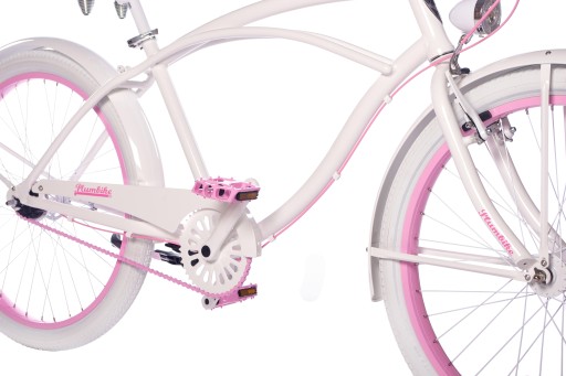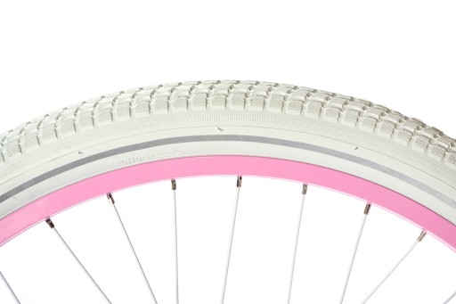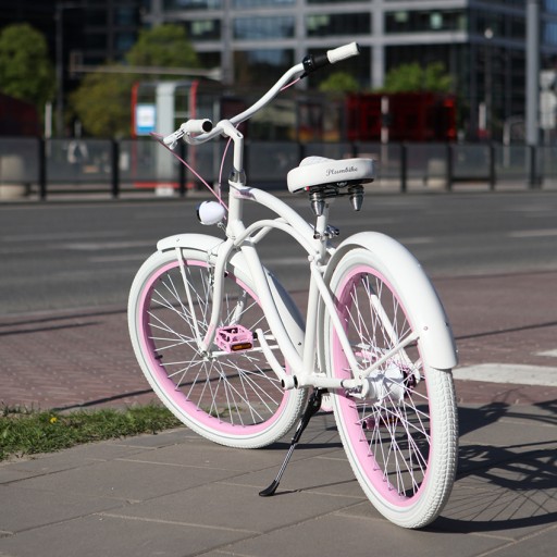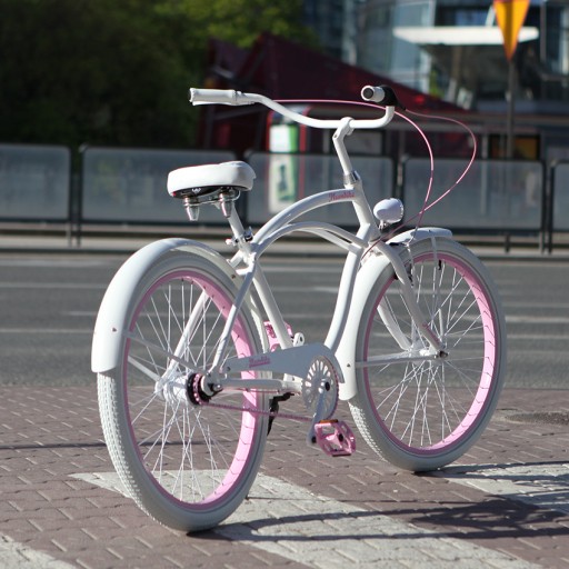 - Wykorzystane kolory - Biały, pudrowy róż. Opony w kolorze białym, chwyty i siodło w kolorze białym.