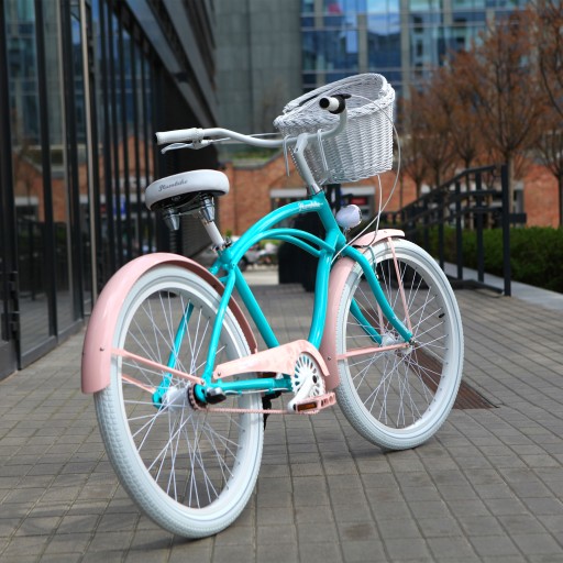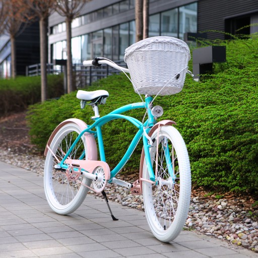 - Wykorzystane kolory - Biały, turkusowy, róż wenecki. Opony w kolorze białym, chwyty i siodło w kolorze białym.