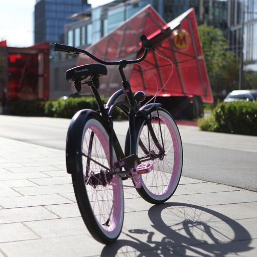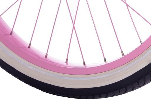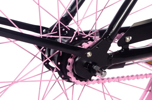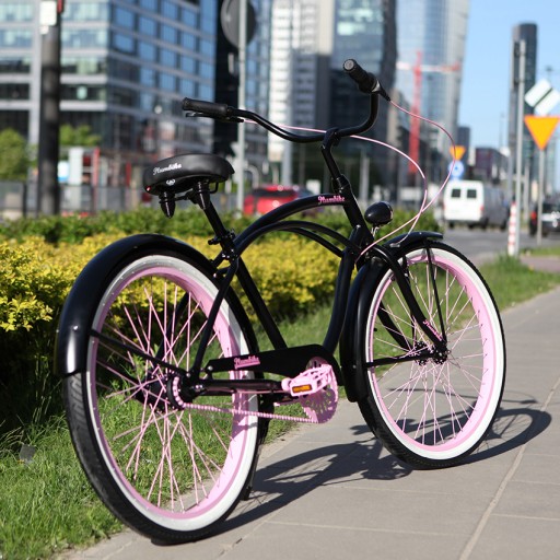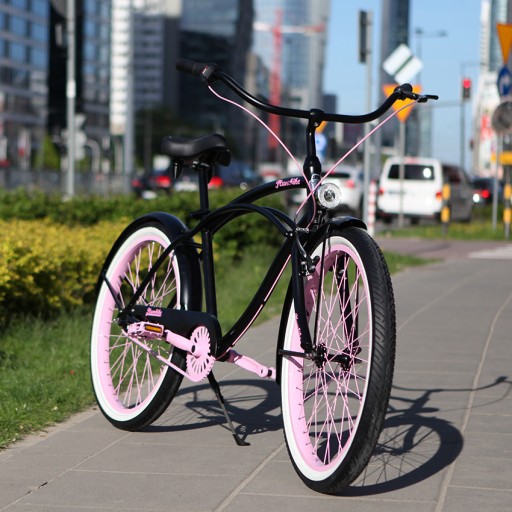 - Wykorzystane kolory - Czarny mat, pudrowy róż. Opony w kolorze czarno - białym, chwyty i siodło w kolorze czarnym.