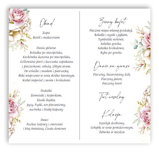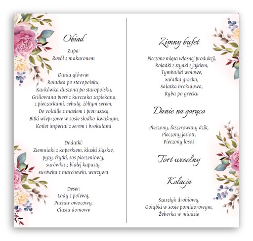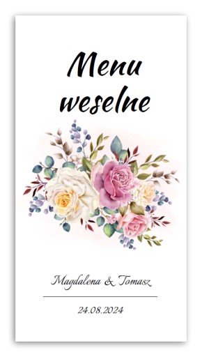 Menu weselne, ślubne, karta dań na stół, KWIATY KW