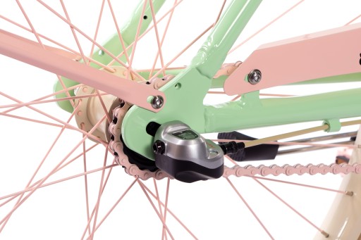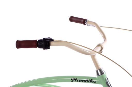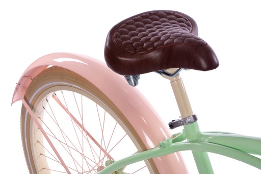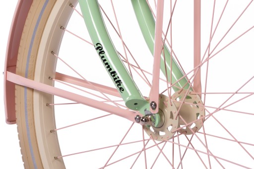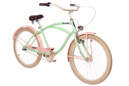 - Wykorzystane kolory - Seledynowy, ecru, róż wenecki. Opony w kolorze ecru, chwyty i siodło w kolorze brązowym.