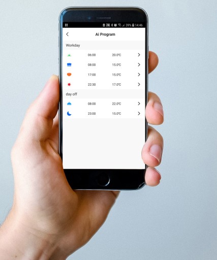Darmowa aplikacja TUYA SMART oraz SMART LIFE dostępna w sklepie PLAY, pozwala na definiowanie scenariuszy, korekcji temperatury względem prognozy pogody lub naszej lokalizacji. Dodatkowym atutem jest możliwość ustawienia harmonogramu z poziomu telefonu, dzięki czemu jest to intuicyjne i przyjazne użytkownikowi.