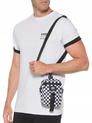 Torba na ramię Vans New Varsity ma czarno-białą grafikę w szachownicę, zewnętrzną kieszenie zapinane na zamek, zapięcie zewnętrznej kieszeni na sprzączkę, regulowany pasek oraz szlufki umożliwiające przypięcie do paska od spodni.