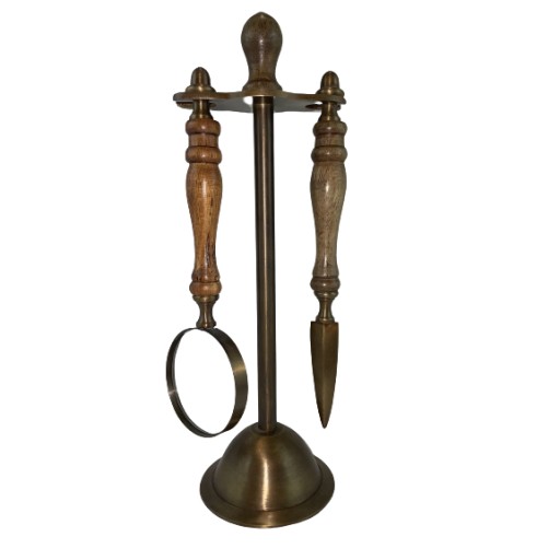 Piękny zestaw w postaci noża do papieru i szkła powiększającego zawieszonego na fantastycznym retro stojaku. Ekskluzywny pomysł na prezent, który spotka się z wielkim uznaniem. Doskonały pomysł na gadżet biznesowy zwłaszcza dla osoby mającej doczynienia z dużą ilością listów, takiej jak adwokat, radca prawny etc.