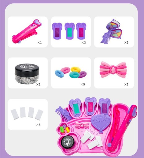 Fryzurę można urozmaicić pozostałymi akcesoriami dołączonymi do zestawu. Znajdziemy tu kolorowe frotki, spinkę w kształcie kokardy, grzebień, wymienne gąbeczki do prostownicy oraz żel z brokatem !