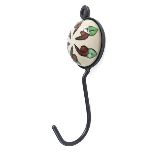 Metalowy, ozdobny wieszak ozdobiony ręcznie malowanym elementem ceramicznym.