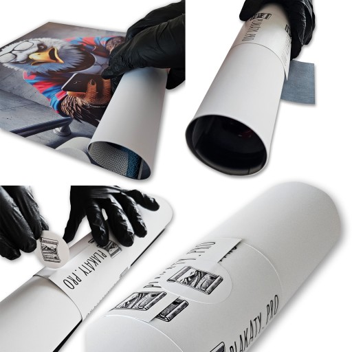 - Zwijanie w rulon: Plakat jest delikatnie zwijany w rulon, z zachowaniem ostrożności, aby uniknąć zagnieceń czy uszkodzeń. Zaczynamy od jednej krawędzi i stopniowo zwijamy całość, dbając o równomierne napięcie papieru. Zwinięty plakat owijamy specjalnym paskiem, który utrzymuje rulon w idealnym kształcie. Dodatkowo zabezpieczamy go naklejką firmową, co nie tylko wzmacnia pakowanie, ale także dodaje eleganckiego wykończenia.