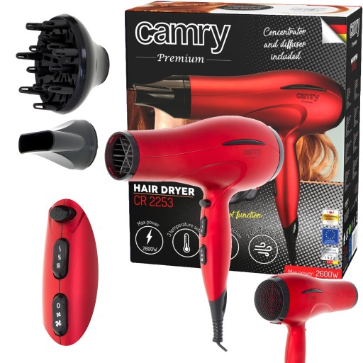 Suszarka Camry 2253 jest wyborem osób wymagających, które dbają o swoje włosy i chcą nadać im piękny wygląd. Suszarka została wyposażona w regulatory zarówno siły nadmuchu, jak i jego temperatury, co obejmuje również zimny nadmuch. W zestawie do suszarki dołączono koncentrator i dyfuzor, które zwiększają możliwości suszenia i układania włosów.
