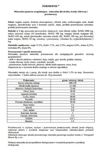 Stosowanie Formofos 1,5 kg: mieszankę stosuje się z paszą dla trzody oraz drobiu w ilości 1-2% na tonę.