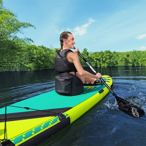Deskę w bardzo łatwy sposób można przekształcić w kajak. Jest to możliwe dzięki czterem odpowiednio rozstawionym mocowaniom typu D-ring do których przypina się siedzisko kajakowe, będącego częścią tego zestawu. SUP posiada również możliwość dopięcia żagla, który należy dokupić osobno. Czteroczęściowe wiosło wyposażone w dwa pióra może służyć zarówno do pływania na stojąco jak i w pozycji siedzącej. Na dziobie znajduje się elastyczna linka typu Bungy, która służy do przymocowania i ustabilizowania rzeczy osobistych jakie chcesz zabrać ze sobą na deskę. Górna powierzchnia deski SUP pokryta jest warstwą pianki antypoślizgowej EVA, która jest bardzo przyjemna w dotyku, a jednocześnie zapewnia świetną przyczepność. Po zakończeniu pływania wszystkie elementy zestawu spakujesz do solidnego, poręcznego plecaka.